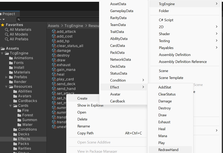In Unity, right click inside a folder, and select Create -> TcgEngine -> Effects, select your new effect, it should be named what you set in the tag [CreateAssetMenu] in your new script.